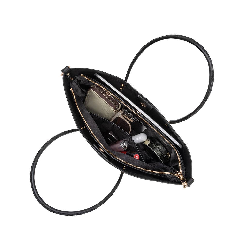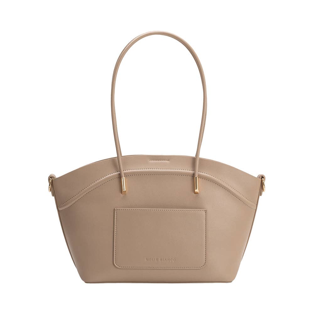 Designed for life on the go, the Hazel tote features double handles and a detachable crossbody strap for easy hands-free carry. Crafted from recycled vegan leather, it includes a removable inner zip pouch to keep essentials organized.