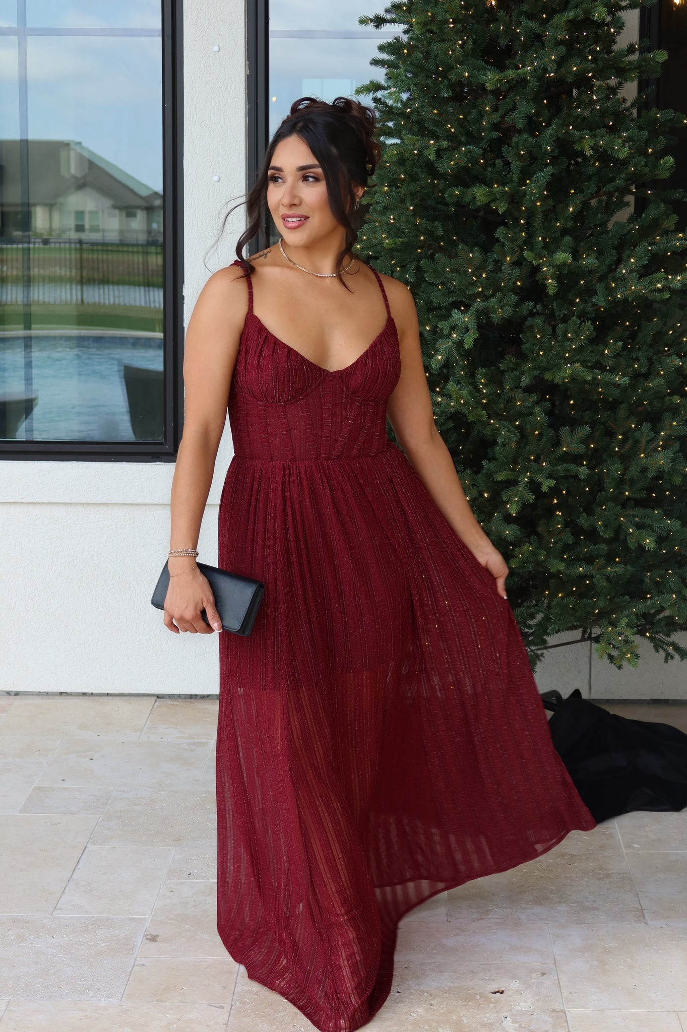 - Shirred waistline extends into flowy maxi skirt
