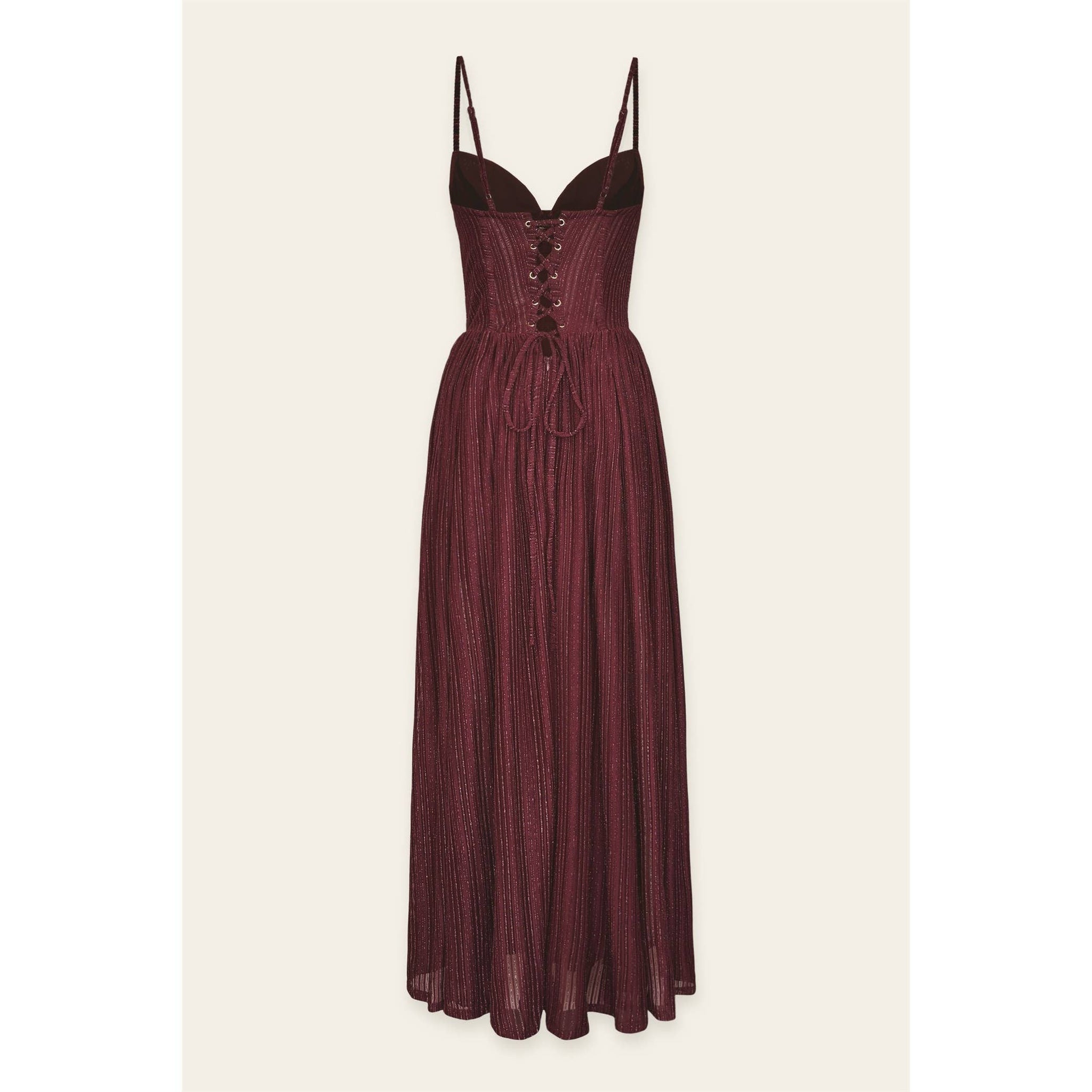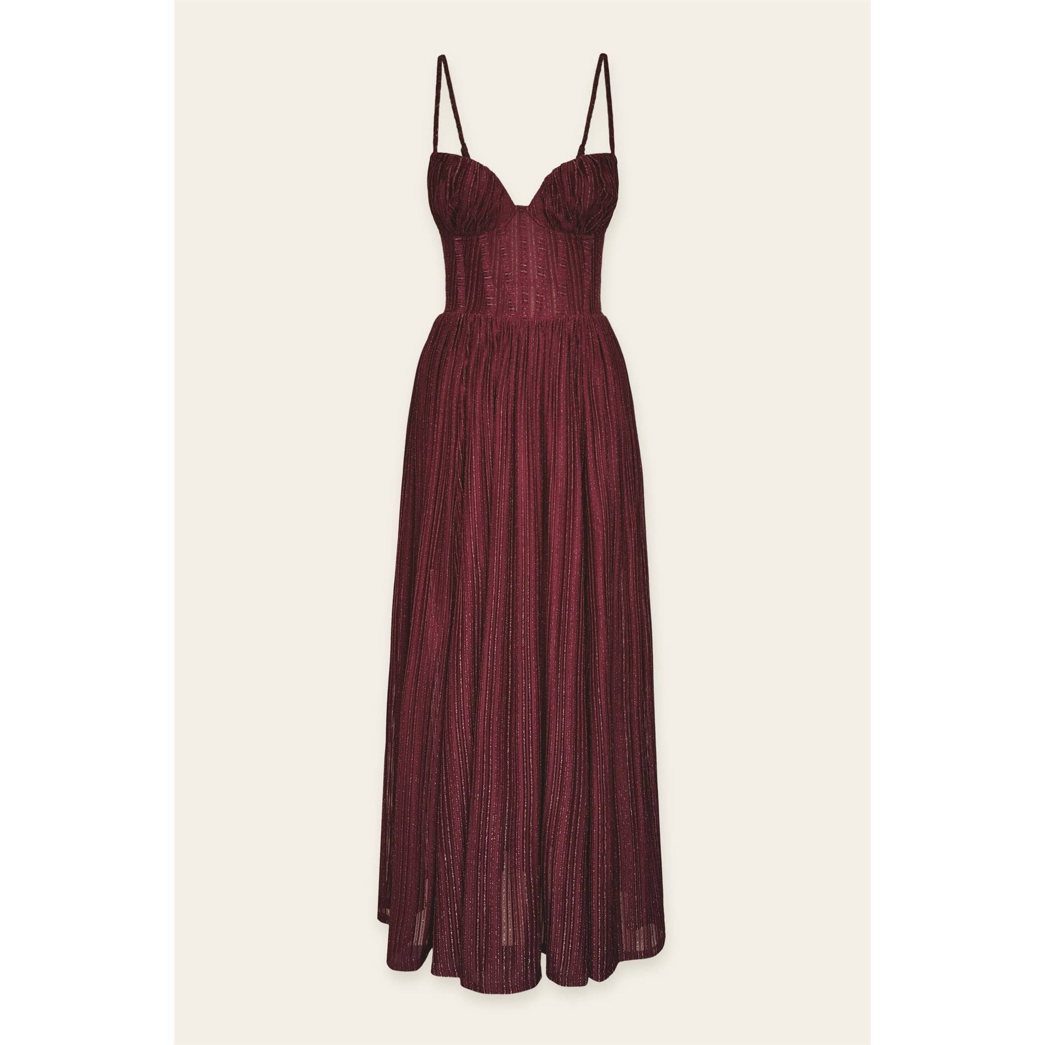 Chiffon maxi dress with a romantic silhouette featuring corset bodice and a flowy skirt.